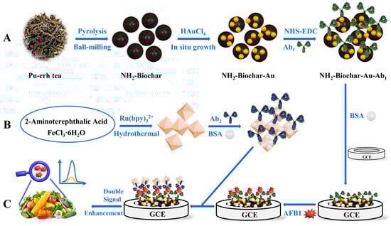 Fabrication process of the ECL immunosensor: (A) the preparation of NH2-Biochar-Au-Ab1, (B) the preparation of MIL-88B(Fe)-NH2@Ru(bpy)32+-Ab2-BSA, and (C) the detection of AFB1.