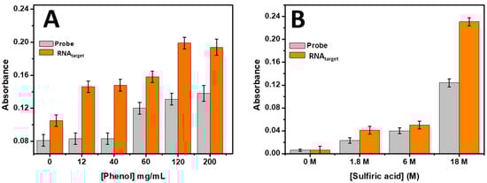 The optimization of reagent concentrations, specifically sulfuric acid and phenol, was conducted to determine the optimal conditions for detecting 0.5 µM of target RNA using the proposed biosensor. Various concentrations of phenol ranging from 0 to 200 mg/mL were tested in combination with concentrated sulfuric acid. The results, presented in Figure 3A, revealed that the absorbance increased with the increase in phenol concentration, reaching a maximum at 120 mg/mL. Based on this finding, which agrees with the literature [,,] and takes into account the concept of green analytical chemistry, a phenol concentration of 120 mg/mL was chosen for subsequent experiments.