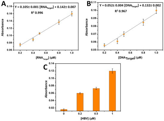 Overall, the developed biosensor exhibits excellent analytical performance with a low limit of detection and a strong correlation between target concentration and color intensity. The linear range obtained meets the concentration values of the extracted DNA or RNA from the well-established kits []. These results demonstrate the potential of the biosensor for sensitive and accurate detection of target DNA or RNA in various applications. For that and as an application, the developed biosensor was tested with various concentrations of hepatitis B virus (HBV) as the DNA target. The DNA capture probe was immobilized on the microplate, and different concentrations of the HBV target (0, 0.2, 0.5, and 1 µM) were added. After the hybridization step, phenol and sulfuric acid were introduced to the wells, and the absorbance was measured at 490 nm. The results are presented in Figure 4C, clearly indicating that the absorbance increased with higher HBV DNA target concentrations, confirming the successful application of the developed biosensor for HBV detection.