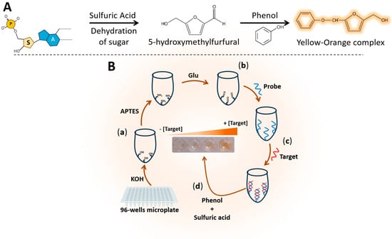 (A) Schematic overview of the phenol–sulfuric acid mechanism for the sugar DNA/RNA analysis. (B) Illustration of the colorimetric biosensor based on the phenol–sulfuric acid reaction for DNA or RNA detection.