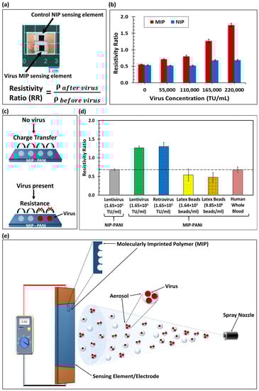 The present research demonstrated a low-cost MIP lentivirus sensor that requires no biological reagent and enables virus detection in liquid and aerosol phases without bulky equipment. We previously developed glucose and perfluorooctanesulfonic acid (PFOS) conductive molecularly imprinted paper sensors [23,24,25] and expanded this approach to the detection of viruses. Lentivirus was used as a proof-of-concept test sample because it can be used in biosafety level 2 labs and is considered a safe alternative to live coronavirus. To form the molecular imprinting template for lentivirus, the virus was blended with a conductive monomer solution polymerized on a polyethylene terephthalate (PET) paper substrate. The lentivirus was then removed from the molecularly imprinted template by ultrasonication. Edges of the conductive MIP sensing paper were connected using two copper metal tapes as electrodes to measure the conductance of the MIP sensing structures. Since the electrical resistance of the conductive polymer polyaniline (PANI) relied on the polaron hopping through π–π stacking, the absorption of virus in the MIP sensing structure modulated the conductance of the paper sensor.