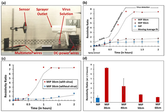 Resistivity ratio as a function of time and distance (n ≥ 5, RSD avg. = 13.3%). Lentivirus aerosol was sprayed for 10 to 12 s (initial volume of lentivirus solution = 2.65 ± 0.15 mL; approximate virus concentration = 2.2 × 105 TU/mL). (a) Photographic image of the aerosol sprayer and virus detection using sensing electrodes. (b) Resistivity ratios for the MIP and NIP sensing elements as a function of time. (c) Resistivity ratio for the MIP sensing element with and without the virus. DMEM was used as a control without the virus. (d) The resistivity ratio (time = 1.5 h) for the MIP sensing element as a function of sprayer distance. The resistivity ratio for the NIP control was averaged across various distances.
