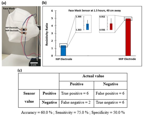 At a detection time of 1.5 h and with the face mask sensor placed 40 cm away from the aerosol sprayer, the resistivity ratios of the NIP and MIP electrodes were found to be 1.364 ± 0.001 and 4.944 ± 0.006, respectively (as shown in Figure 3b), with a virus concentration of 2.2 × 105 TU/mL. The resistivity ratio of this sensor was within the standard deviation at a 40 cm distance (see Figure 2d). This 40 cm distance for the face mask experiment was selected because it is a similarly close distance to two people standing next to each other. The fluctuation in aerosol volume reaching the face mask sensor electrodes at 40 cm, which is the critical spray distance, could have caused the MIPface mask value to be at the extreme end of the MIP40 cm aerosol detection curve.
