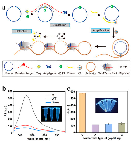 (a) Schematic explaining the method of the RCA-CRISPR/Cas12a technique for SNV detection; (b) representing the fluorescence intensity and real product photo corresponding to 200 nM mutant and wild-type targets and blank group; (c) showing the fluorescence intensity corresponding to the gap-filling with different nucleotides. Reproduced with permission from [56]. Copyright 2021 Elsevier.