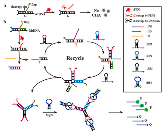 (A) Illustration of PO/IO/WtDNA strands hybridize to form trinucleotide repeat (TR) substrates that were recognized and cleaved by FEN1 and cannot trigger subsequent CHA reactions; (B) Schematic diagram of DNAzyme ligation triggered by CHA-induced invasion detection for ultrasensitive and specific detection of SNPs in the K-ras gene. Reproduced with permission from [63]. Copyright 2022 Elsevier.