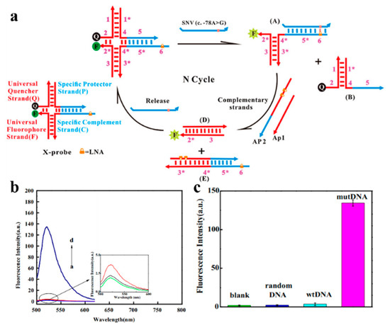 Wu et al. developed a selective fluorescent biosensor based on an X-shaped probe, locked nucleic acid (LNA), and toehold-mediated strand-displacement reaction (TMSDR) (Figure 4). The LNA-integrated X-shaped probes could be isolated from target-specific regions and had prominent discernibility for β-thalassemia SNV. The introduction of the TMSDR-assisted recycling amplification system significantly improved the sensitivity. The detection limit under this strategy was up to 6 fM [64].