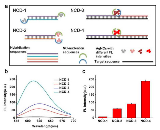 (a) Illustration of diversified hybridization structures of novel fluorescent molecular probes based on different nanocluster beacons; (b) Fluorescence spectra of NCD-1, NCD-2, NCD-3, and NCD-4 after hybridization; (c) Fluorescence intensities of NCD-1, NCD-2, NCD-3, and NCD-4 after hybridization at maximum emission. Reproduced with permission from [72]. Copyright 2017 Analytical Chemistry.