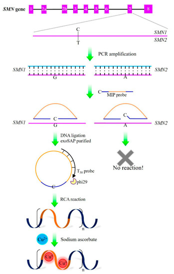 - Chen, C.A.; Wang, C.C.; Kou, H.S.; Wu, S.M. Molecular inversion probe-rolling circle amplification with single-strand poly-T luminescent copper nanoclusters for fluorescent detection of single-nucleotide variant of SMN gene in diagnosis of spinal muscular atrophy. Anal. Chim. Acta 2020, 1123, 56–63. [Google Scholar] [CrossRef]
