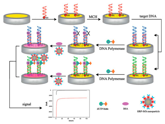 Zhao and colleagues developed an ultrasensitive electrochemical method to detect point mutations in the K-ras gene by combining streptavidin horseradish peroxidase (streptavidin-HRP)-modified SiO2 nanoparticles and DNA polymerase in the sandwich design. In this design (Figure 7), the streptavidin-HRP-SiO2 nanoparticles had the effect of amplifying the signal. HRP reacted catalytically with 3,3’,5,5’-tetramethylbenzidine (TMB) to produce an electrochemical signal. A wide linear range (0.001–100 pM) and 0.42 fM detection limit was reported under this design [101]. Its simplicity and cost-effectiveness give it an advantage over PCR-based assays.