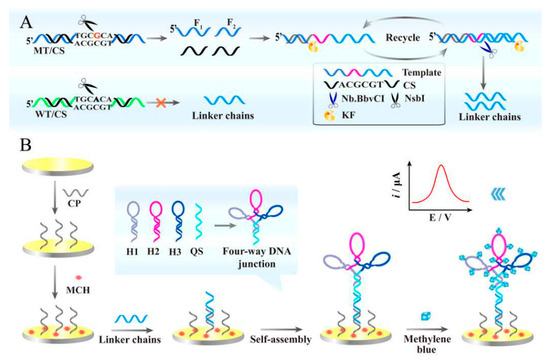 (A) Illustration of the properly matched MT/CS dsDNA was recognized by NsbI and cleaved to initiate the SDA reaction; (B) Schematic diagram of the electrochemical DNA sensor based on NsbI-SDA and four-way DNA junction. Reproduced with permission from [103]. Copyright 2020 Elsevier.