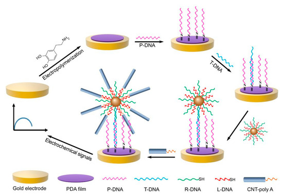 DNA-stabilized gold nanoparticles (AuNPs) are widely used for SNP detection [109,110,111,112,113]. Han et al. developed a facile, ultrasensitive DNA biosensor based on urchin-like carbon nanotube–AuNP-conjugated (CNT-AuNP) nanocluster signal amplification. When the dopamine-modifying gold electrode was attached to the DNA probes, DNA-functionalized AuNPs were led to the biosensor through DNA bases complementation. Then, CNTs with end-modified DNA were linked with AuNPs to form 3D radial nanoclusters, which generated significant electrochemical signals (Figure 10). Due to the large contact surface area and ultra-strong electronic conductivity of the CNT-AuNP clusters, this 3D radial nanostructure exhibited ultrasensitive detection ability, good selectivity, and excellent stability and regeneration ability for DNA detection, which obtained a low LOD of 5.2 fM [114].