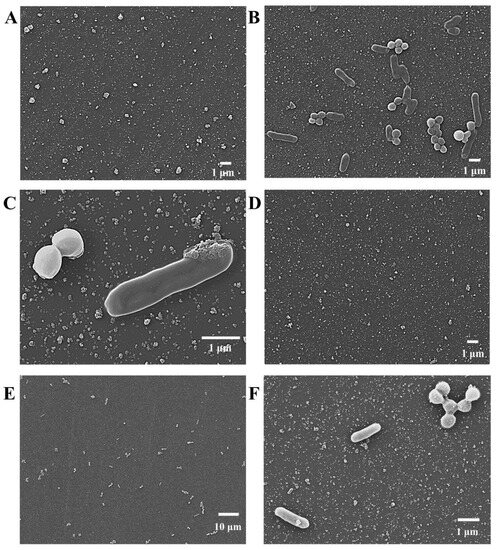 SEM images showing the morphological changes in the electrode surface at various stages during the preparation of the DBIP. (A) PoPD/GCE, (B,C) PoPD+dual bacteria/GCE with 5000- and 20,000-fold magnification, (D) DBIP/GCE, (E,F) DBIP-(E. coli O157:H7+S. aureus)/GCE with 1000- and 10,000-fold magnification.