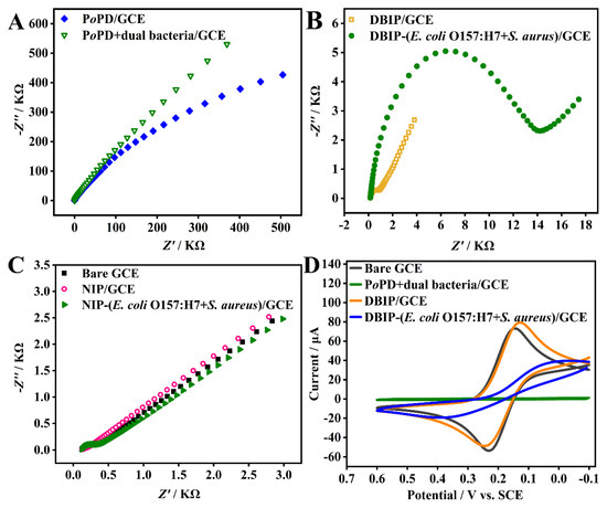 The DBIP fabrication processes and the recognition response were thoroughly characterized using EIS and CV. Figure 2A–C represent the EIS Nyquist plots of different modified GCEs. The bare GCE displayed an almost straight line (Figure 2C, solid square), indicating a mass diffusion-limited electron transfer process [39]. The impedance behavior was high when the dual bacterial template was electro-polymerized onto the GCE surface with oPD monomer, owing to the non-conductive nature of both bacteria and PoPD. However, after elution with CTAB/HAc for 10 min, the impedance substantially decreased to around 400 Ω for the modified electrode (DBIP/GCE) (Figure 2B, hollow square), confirming the successful removal of the bacterial template.