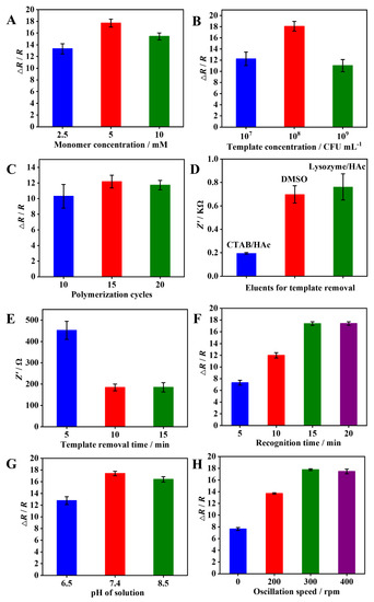 Optimization of parameters for the DBIP fabrication and bacterial recognition: (A–B) concentration of monomer and bacterial template during electro-polymerization; (C) number of polymerization cycles; (D–E) different eluents and elution time for removal of bacterial template; (F–H) recognition time, pH condition, and oscillation speed during the recognition process.