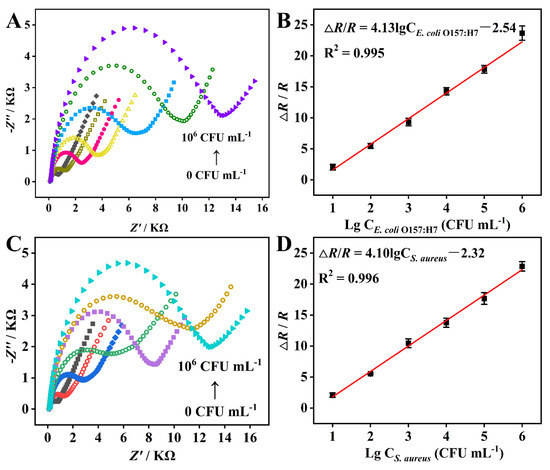 (A,C) EIS Nyquist plots and (B,D) corresponding calibration curves obtained from the DBIP sensor for the separate quantitative detection of E. coli O157:H7 and S. aureus over a range of concentrations from 0 to 106 CFU mL−1.