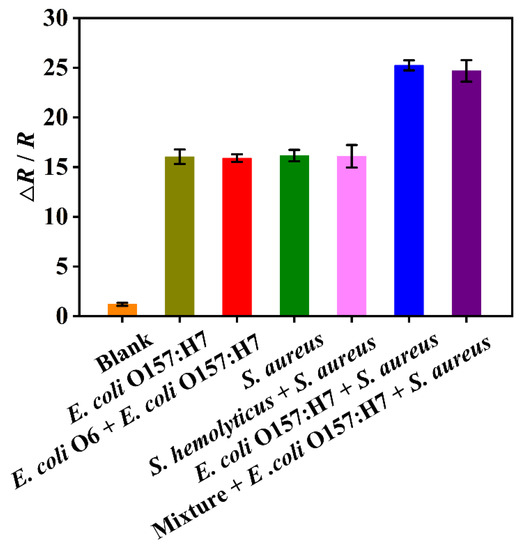 Selectivity of the DBIP sensor for detection of E. coli O157:H7 and S. aureus. Mixture refers to a mixed bacterial solution of E. coli O6 and S. hemolyticus. Each bacterium in the different samples was kept at the same concentration of 105 CFU mL−1.