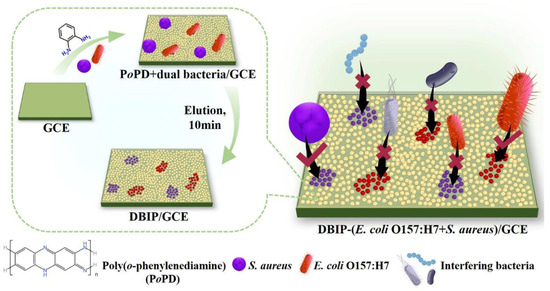 Before use, the GCE was polished with 0.3−0.05 μm of alumina aqueous slurry until it had a shiny appearance. Then, the polished GCE was immersed in acetate buffer solution (0.1 M, pH 5.8) containing oPD (5 mM) and double bacterial template of E. coli O157:H7 and S. aureus (both at 108 CFU mL−1), and CV was carried out under gentle stirring for 15 cycles with a potential range of −0.05 to 0.95 V vs. SCE and a scan rate of 0.05 V s−1 [36]. To elute the bacterial template, the modified electrode was soaked in CTAB/HAc solution (1 mM CTAB dispersed in 36% HAc) at 37 °C for 10 min under constant shaking (400 rpm). The fabricated modified electrodes before and after template removal were named PoPD+dual bacteria/GCE and DBIP/GCE, respectively. A non-imprinted polymer (NIP)-modified electrode (NIP/GCE) was prepared using the same steps but without adding the bacterial template.