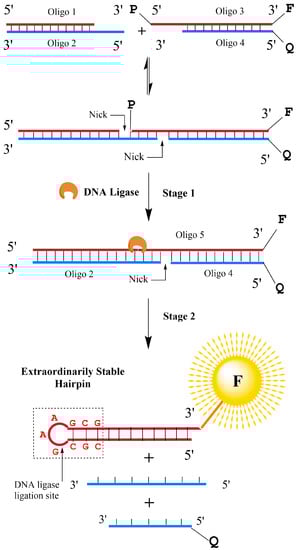Schematic illustrations of our extraordinarily stable hairpin-based designs for detecting DNA ligase activities. Without DNA ligase, duplex forms of DNAs are in equilibrium, and the fluorophore and quencher moieties always remain in proximity. In the presence of DNA ligase, on the other hand, this enzyme catalyzes the nick-sealing between Oligo 1 and Oligo 3, which leads to the generation of Oligo 5 (Stage 1). Since the newly formed Oligo 5 holds a 5′ CGCGAAGCG 3′ segment in its sequence, it will form an extraordinarily stable hairpin spontaneously (Stage 2). As a result, signals of the previously quenched fluorophore are restored.