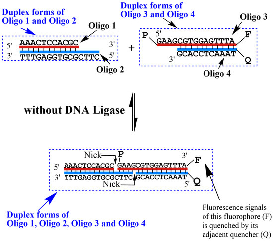 In consideration of the facts that Tm (5′ CGCGAAGCG 3′) 88.5 °C > Tm (complete duplex) 74 °C > Tm (the double-stranded structures formed by Oligo 1 and Oligo 2) 44 °C > Tm (the double-stranded structures formed by Oligo 3 and Oligo 4) 38 °C > 37 °C, Oligo 1 and Oligo 3 can be ligated in the presence of DNA ligase to form a long single-stranded Oligo 5, in which an extraordinarily stable hairpin was induced to stimulate the dehybridization of Oligo 5 from the double-stranded structures (Figure 1). The abovementioned Tm (melting temperature) values were simulated using the Tm Calculator from Thermo Scientific Web Tools, provided by Thermo Scientific. This thermodynamic-driven spontaneous process causes the efficient dissociation of fluorophores and quenchers and produces remarkable fluorescence signals. Without DNA ligases, the double-stranded structures formed by Oligo 3, Oligo 4, and Oligo 5 remain stable upon heating and thus produce no fluorescence signals. The details of our designed biosensors are depicted in Figure 2. They consist of a 26-bp nucleotide sequence with a GC content of 50%. The target structure it aims to form is an extraordinarily stable hairpin, comprising a single-stranded oligonucleotide chain of 26 deoxyribonucleotides. Within this sequence, there are 11 base pairs of complementary pairings. The “nick” refers to the absence of phosphodiester bonds between the adjacent 5′ phosphate and 3′ hydroxyl ends. Between the two “nicks”, there exists a cohesive end featuring four complementary base pairings, which provides sufficient recognition and binding regions for DNA ligases.