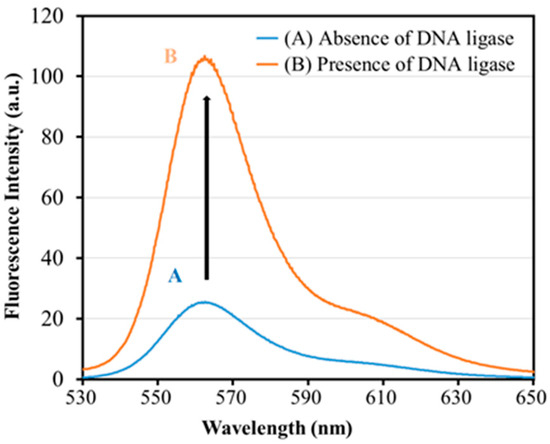 Deoxyribonucleic acid (DNA) ligase is an essential and ubiquitous enzyme involved in DNA replication, repair, and recombination in prokaryotic and eukaryotic cells. This enzyme catalyzes the formation of phosphodiester bonds between the juxtaposed 5′ phosphate end and 3′ hydroxyl end in double-stranded DNA in the presence of ATP [1,2,3,4]. Regardless of their sources, DNA ligase-catalyzed reactions’ ligation mechanism shares a common feature: the critical step is forming a covalent DNA ligase–adenylate intermediate [5]. In addition, it has been known that DNA ligases in eukaryotes, archaea, and viruses are ATP-dependent, while those in bacteria are NAD-dependent [6,7,8]. As a result, NAD-dependent DNA ligases have been the targets of new antibacterial agents, as they are widely present in bacteria but rare in mammalian cells [9]. DNA ligases have also been used as cancer biomarkers in recent years [10] because their over-expressions and defects are closely correlated with the pathogenesis of cancer and neurodegeneration [11]. Furthermore, DNA ligases have been used as vital tools in in vitro manipulations of DNA, such as DNA nanotechnology, DNA computing, and DNA sensing [12]. Therefore, DNA ligase activity detection is significant for drug development, medical diagnosis, and basic biochemical research. The conventional means for detecting DNA ligases’ activities mainly rely on immunological detection methods, such as Western blot and ELISA, which are complicated and require specialized facilities. In addition, DNA ligase detection through multiple enzymes and multi-step reactions has been developed in the past [13,14]. However, a drawback of these methods is that their detections introduced many unnecessary factors, reducing their specificity and limiting their real-time application.