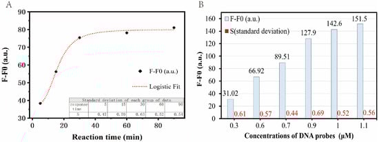 In addition to the incubation time, the DNA probe concentration was also optimized in our study. In theory, it is evident that fluorescence intensity increases with an increase in probe concentration, particularly in the presence of a relatively high enzyme concentration. As depicted in Figure 4B, under conditions of 1.3 U/mL DNA ligase (a relatively high concentration), we observed that when the concentration of the DNA probes reached 900 nM, the growth rate began to decrease. Further increasing the probe quantity would hardly result in better sensitivities. Thus, 900 nM was selected in our current studies as the standard probe concentration, which can also be adjusted according to the actual situation of the specific application environment.