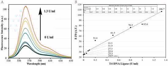 A regression analysis was performed with the fluorescence intensities collected at 561 nm, as shown in Figure 5B. According to the guideline EP17 [18], published by the Clinical and Laboratory Standards Institute (CLSI), the limit of detection (LoD) of our newly developed DNA probes on T4 DNA ligases is calculated as 0.055 U/mL as follows, which is at the same level as some of the previously reported susceptible methods [13,14].