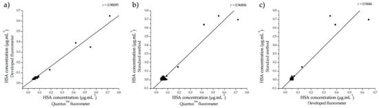 3.2.2. Comparison of HSA Detection in Urine Samples Using the Developed Fluorometer, Commercial Fluorometer, and Standard Hospital Method