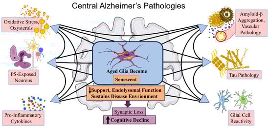 - Lau, V.; Ramer, L.; Tremblay, M.E. An aging, pathology burden, and glial senescence build-up hypothesis for late onset Alzheimer’s disease. Nat. Commun. 2023, 14, 1670. [Google Scholar] [CrossRef] [PubMed]