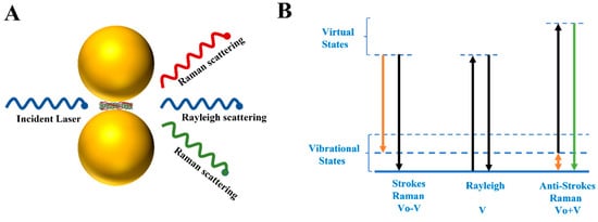 In 1928, C.V. Raman discovered by chance that during an experiment, incident and scattered light did not have the same frequency when passing through a transparent medium. This interesting phenomenon is now known as Raman scattering []. As we know, the incident photons are absorbed by molecules of the medium when passing through it (Figure 3A). In most cases, the molecules would re-emit photons without exchanging energy under laser irradiation (Rayleigh scattering) []. However, parts of the re-emitted photons were presented as being higher or lower than the incident photons in terms of energy, and the frequency and direction of the re-emitted photons also changed, which was Raman scattering (Figure 3B). Studies revealed that the intensities of Rayleigh scattering and Raman scattering were reduced to 10−3 and 10−6 orders of magnitude compared to those of the incident light, respectively []. Consequently, there is an urgent need for effective strategies to amplify Raman signal intensity in molecular analysis.
