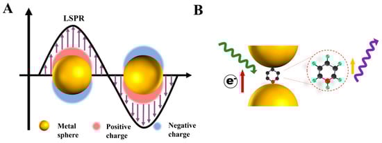 Although SERS is widely used in various fields, the explanation of the theory of SERS enhancement is still not perfect. Currently, the mainstream explanations for SERS enhancement are electromagnetic enhancement and chemical enhancement (Figure 4A) []. As the main factor of SERS signal enhancement, electromagnetic enhancement is mainly based on localized surface plasmon resonance (LSPR) [,], which is theoretically based on the incident light-induced collective oscillations of free electrons on the surface of plasma nanoparticles. The collective oscillation of free electrons enhances the electromagnetic field intensity around the metallic nanostructure, eventually leading to Raman signal enhancement. The effect of Raman signal enhancement caused by LSPR is roughly proportional to the fourth magnitude of that produced by the metal structure itself. In addition, rough plasmonic nanoparticles can generate inhomogeneous electric field distributions. For instance, the electromagnetic intensity of sharp tips presented on the surface of a rough plasmonic nanoparticle can be sharply enhanced due to the lightning rod effect [], namely, “hot spots”. The gaps that result from the nanoparticles being in close proximity to each other or overlapping can also create “hot spots”. It is reported that Raman signal amplification caused by “hot spots” is approximately equal to 106~108 power of traditional Raman signal amplification [].
