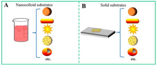 Types of SERS substrates. (A) Various nanocolloid substrates, which are constructed by using nanoparticles, nanorods, nanoflowers, alloy nanoparticles, core-shell nanoparticles, and so on. (B) Various solid substrates, which are constructed by using nanoparticles, nanorods, nanoflowers, alloy nanoparticles, core-shell nanoparticles, and so on.