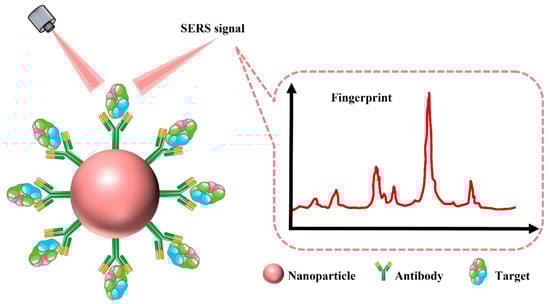 Schematic illustration of the principle of the label-free assay strategy. The fingerprint information for a target can be obtained by detecting SERS spectroscopy, where target molecules are directly attached to the surface of metal nanoparticles without any labels under higher scattering efficiencies.