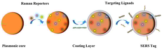 Schematic illustration of the tag synthesis process. First, the plasmonic core is modified with Raman reporters and then coated with a protective layer such as bovine serum proteins, which are used for enclosing nonspecific binding sites. Finally, targeting ligands, such as antibodies and aptamers, are attached to the surface of the plasmonic core to form SERS tags.