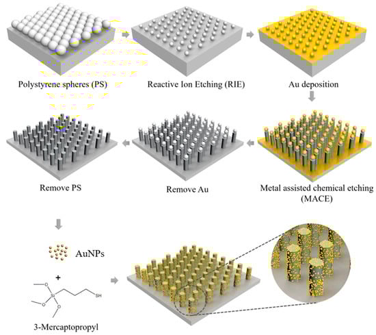 Schematic illustration of the fabrication of AuNP-conjugated SiNR arrays. Close-packed monolayer of PS nanospheres on a clean Si-reduced diameter of PS by reactive ion etching, Au deposition, metal-assisted chemical etching, removal of Au/PS, conjugation with Au nanoparticles. The figure is adapted from ref. [] Copyright © 2017 American Chemical Society.