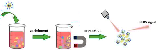 Mechanism of the magnetic separation-SERS based detection. First, magnetic nanoparticles are added into the sample to capture target molecules. and then, the captured complexes are separated and enriched using a magnetic device. Finally, the separated complexes are detected by the SERS detection device. MB means magnetic bead.