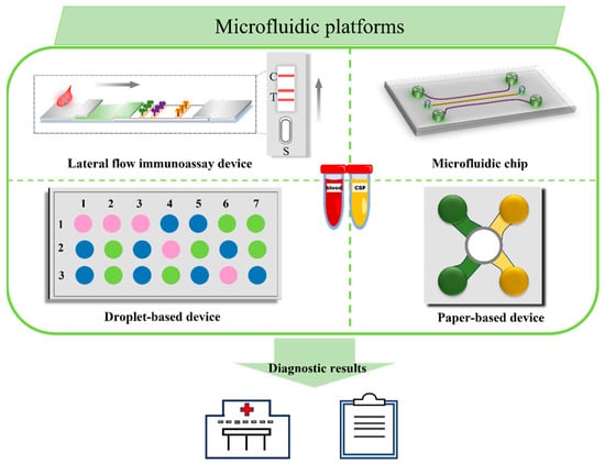 Schematic illustration of multiplied microfluidic platforms. The multiplied microfluidic platforms consist of lateral flow immunoassay devices, microfluidic chips, droplet-based devices, paper-based devices, and so on, which have the advantages of small size and simple operation and can rapidly and accurately diagnose AD by analyzing the blood and CFS from the patients.