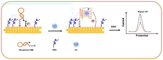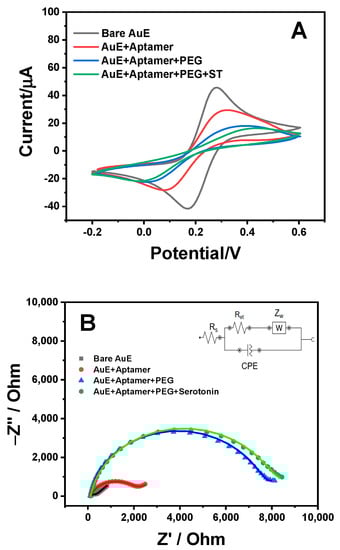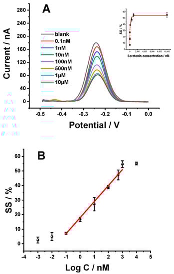 - Li, R.; Li, X.; Su, L.; Qi, H.; Yue, X.; Qi, H. Label-free Electrochemical Aptasensor for the Determination of Serotonin. Electroanalysis 2022, 34, 1048–1053. [Google Scholar] [CrossRef]