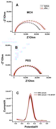 - Anne, A.; Demaille, C.; Moiroux, J. Terminal Attachment of Polyethylene Glycol (PEG) Chains to a Gold Electrode Surface. Cyclic Voltammetry Applied to the Quantitative Characterization of the Flexibility of the Attached PEG Chains and of Their Penetration by Mobile PEG Chains. Macromolecules 2002, 35, 5578–5586. [Google Scholar] [CrossRef]