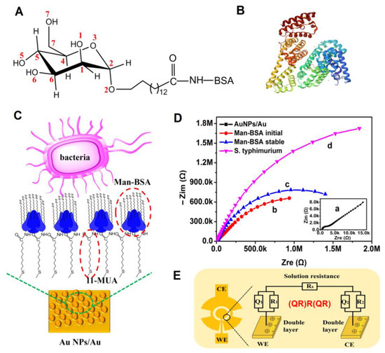 (A) Chemical structures of D-mannose-BSA. (B) Crystal structure of BSA (PDB: 3V03). (C) Schematic diagram of the preparation of the neoglycoprotein nanosensing surface Man-BSA/Au NPs. (D) Characterization of the microelectrode and Man-BSA/Au NPs via EIS. (a) Nyquist plot of Au NPs-modified microelectrode, (b) Nyquist plot of Man-BSA fixed on the Au NPs at the initial time, (c) Nyquist plot of Man-BSA/Au NPs incubated in PBS to stable, (d) Nyquist plot after S. typhimurium absorbed on the Man-BSA/Au NPs. (E) Equivalent circuit model (QR)R(QR) for analyzing the EIS.