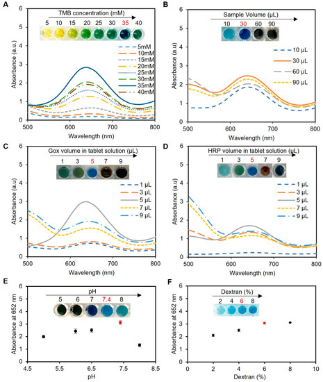 Optimization of the experimental conditions for glucose detection using enzyme-based tablets. (A) Optimization of the TMB concentration using various concentrations of TMB (5–40 mM). The results indicated that 35 mM TMB was the best to give the desired blue color, while concentrations from 5 to 15 mM gave a yellow color, a greenish color was obtained in the concentrations between 20 and 30 mM, and a very dark blue was observed using 40 mM TMB. (B) The effect of the sample volume on the blue color development. A sample volume of 30 µL produced the most intense blue color. (C,D) Optimization of enzyme concentration in tablets. The enzyme ratio was carefully optimized using 5 µL of HRP and 5 µL of GOx in 50 µL of citrate–phosphate buffer (pH 5) to prepare the solution of one tablet. This ratio achieved the desired blue color without excess accumulation or incomplete oxidation of TMB. (E) pH optimization of the system. The pH of the reaction mixture was investigated, and a pH of 7.4 was identified as the optimal condition for the system. (F) Optimization of dextran concentration for better enzyme encapsulation. The results indicated that a 6% w/v concentration effectively preserved enzymatic activity and led to the desired blue color development. Lower concentrations (2% and 4% w/v) compromised enzymatic activity, while an 8% w/v concentration increased viscosity, making the solution challenging to handle during the pipetting and drying processes. Therefore, a 6% dextran w/v solution was used to create the tablet sensor used throughout the study.