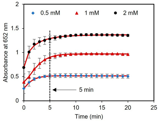 Next, we performed a kinetic study with different concentrations of glucose (0.5, 1, and 2 mM) to evaluate the optimal time for reading the results. The time course of light absorbance was measured for three samples spiked with glucose using a UV-vis spectrometer. The absorbance at 652 nm was measured at 1 min intervals over a total time of 20 min. After 5 min of reagent incubation, there were no significant changes in the absorbance of the samples, indicating that the sensor response had stabilized and reached saturation, as presented in Figure 5. Therefore, 5 min was chosen as the optimal time to measure the readings of the assay after adding the tablet sensor to the samples.