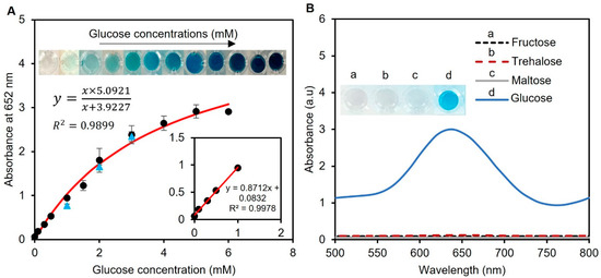 Analytical performance of the assay and interference study. (A) Glucose concentrations between 0.1 and 6 mM were used to create the calibration curve. The curve was found to follow the Michaelis–Menten equation with an R2 > 0.98, showing the compatibility of the data with a standard saturation model. The inset shows the linear range of the detection system between 0 and 1 mM. Real human urine samples were also tested with spiked glucose concentrations of 1, 2, and 3 mM (blue triangle points). Each data point is the mean ± the standard deviation of three replications. (B) The potential interferants of glucose were tested using 10 mM fructose, trehalose, and maltose. While the working solution remained colorless for all three sugars, a glucose sample of 0–6 mM was able to turn the solution blue, indicating the sensor’s specificity towards glucose detection.