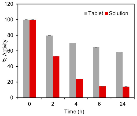 Stability tests of the enzymatic tablet-based assay under stress-testing conditions at 60 °C compared with the similar enzymatic assay stored in the solution phase. The thermal activity test was carried out by comparing the activity of tablet and solution-based sensors over a duration of 24 h. The solution exhibited a loss of 85.8% of enzymatic activity, whereas the tablets demonstrated a lower activity loss of only 41.5%.