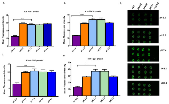 Effect of different pH on the immobilization of antigens on epoxy-coated glass slides. The antigens were printed and washed with PBS at different pH values. The bar graphs show fluorescence intensity obtained with M.tb pstS1 (A), CFP10 (B), ESAT6 (C) and HIV-1 p24 (D). Data represent mean ± standard deviation and error bars are standard deviation (n = 3). Asterisks signify statistical significance (p < 0.05) between the fluorescence intensity of the highest reading and the lowest. (E) shows representative images obtained at different pH (pH 5.0, 6.0, 7.4, 8.0 and 9.0).