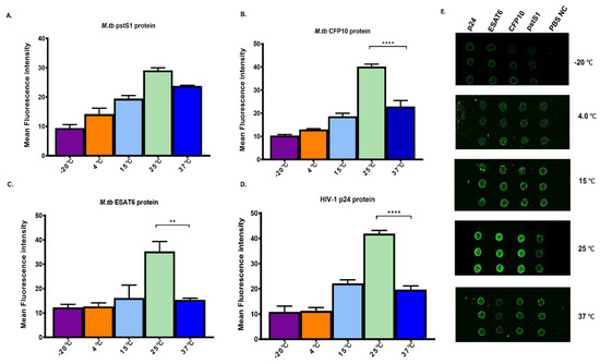 The optimal storage and reaction temperature for the immobilized antigens was also evaluated, as temperature can play an important role in the stability of proteins on functionalized microarray slides [30,36]. This study was performed by immobilizing the antigens on the epoxy-coated glass slides in triplicate and incubating them at different temperature conditions (−20 °C, 4 °C, 15 °C, 25 °C, 37 °C) for 24 h. This was followed by washing with PBS at pH 7.4, which was one of the optimal pH established previously. The antigens were reacted with a cocktail of their associated primary antibodies at the concentration of 3.906 µg/mL, and fluorescence was measured after the addition of secondary antibodies labelled with a fluorescence dye. The 3.906 µg/mL primary antibody concentration used was determined experimentally to be optimal (Appendix A, Figure A1). Based on the fluorescence intensities in Figure 3, the optimal temperature at which the p24, CFP10, ESAT6 and pstS1 antigens reacted with their antibodies was 25 °C, followed by 37 °C, 15 °C and 4 °C, while −20 °C had the lowest intensity. In fact, in general, the fluorescence intensity from slides stored at 25 °C was about 2-fold higher than the second-best storage temperature, and these differences were statistically significant (p < 0.05) for all antigens except pstS1 (Figure 3).