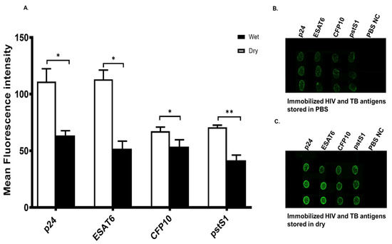 After studying the stability of the immobilized antigens under different pH and temperature conditions, the next step was to determine whether the immobilized antigens on the epoxy glass slides should be stored dry or wet. We investigated this at pH 7.4 and room temperature, given that they were determined to be optimal. This was done by printing the HIV-p24 as well as M.tb CFP10, ESAT6 and pstS1 antigens on glass slides followed by 24 h incubation at room temperature in PBS pH 7.4, which represented the wet condition, or dry. From the results obtained, we observed fluorescence with both dry and wet slides (Figure 4). However, this intensity was lower for the antigens stored in PBS relative to the antigens stored dry (Figure 4B,C). In fact, the fluorescence intensity was decreased by 2-fold for HIV-1 p24 and ESAT6, while the decrease was about 1.5-fold for CFP10 and pstS1. All these decreases were statistically significant (p < 0.05). Therefore, storage in the dry proved to be the optimal condition.