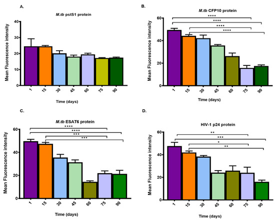 Evaluation of the shelf-life of the immobilized HIV and TB antigens on the epoxy-coated glass slides. The antigens were stored dry at room temperature from day 1 to day 90, followed by addition of primary and secondary antibodies, with fluorescence readings after every 15 days. The bar graphs show fluorescence intensity when M.tb pstS1 (A), CFP10 (B), ESAT6 (C) or HIV-1 p24 (D) were stored dry for 90 days. Data represent mean ± standard deviation (n = 2) and asterisks signify significant difference between the groups compared.