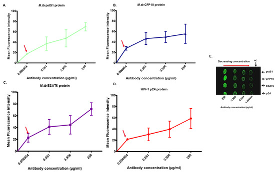 Evaluation of sensitivity of epoxy-coated glass slides assay in PBS. Primary antibodies were serially diluted in PBS while the antigen and secondary antibody concentrations were kept constant. Fluorescence intensity values for pstS1 (A), CFP10 (B), ESAT6 (C) and p24 (D) are presented as line graphs, and the limit of detection is indicated by the red arrow. Data represent mean ± standard deviation (n = 4). (E) A representative image of the fluorescence emitted on the microarray slide.