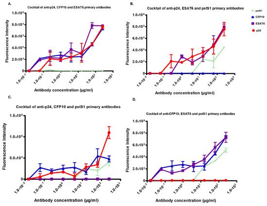 Microarray plates’ antigen-antibody reaction specificity in human serum. Immobilized antigens were incubated with cocktails of primary antibodies, missing one antibody at a time. Antigens and secondary antibody concentrations were kept constant, while primary antibodies were serially diluted. (A) A line graph representing the fluorescence intensity obtained when immobilized antigens were incubated in a cocktail of primary antibodies missing the anti-pstS1 antibody; (B–D) graphs for anti-CFP10 or anti-ESAT6 or anti-p24, respectively. Data represent mean ± standard deviation (n = 4).