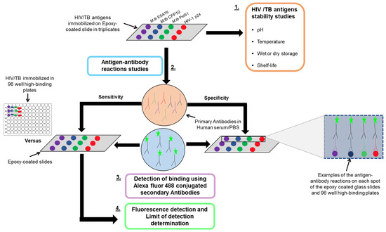 A schematic diagram showing the representation of the research strategy used to develop the HIV and TB multiplex microarray technology. The strategy started with stability studies of the immobilized antigens followed by sensitivity and specificity studies.